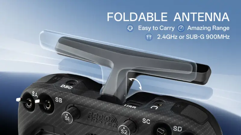 The TX15 MAX features a LR1121 Semtech transceiver, supporting both 2.4GHz or 900MHz ExpressLRS (ELRS) for long-range, low-latency performance. Whether you're flying daily or operating in challenging RF environments, the TX15 MAX is built to perform. A smart balance battery circuit maximizes flight time, while the compact, foldable antenna design improves portability and ensures strong signal quality. The built-in gyro with TiltX/TiltY functions unlocks advanced control options, allowing you to trigger switches, pan/tilt cameras, or activate telemetry callouts with a simple tilt of your radio.