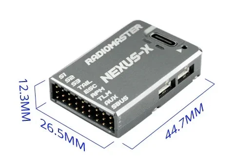 - Telemetry: S.BUS, HoTT, S.Port, MSP, EDGETX, ELRS